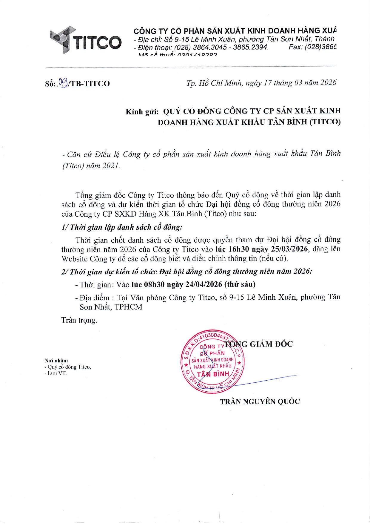 Thông báo về việc lập danh sách cổ đông và thời gian dự kiến tổ chức Đại hội đồng cổ đông thường niên năm 20254 Tháng 3, 2025